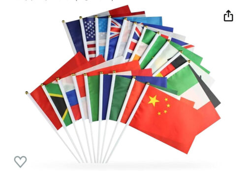 手に持っているのは様々な国の国旗です。