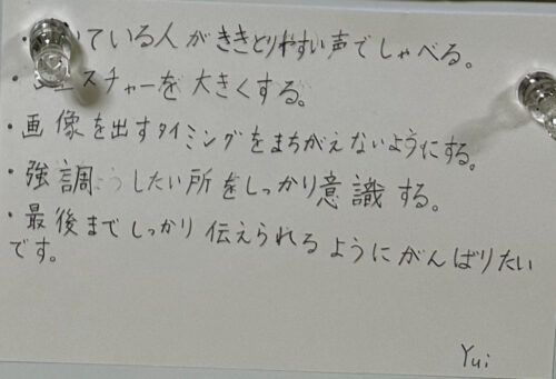 同学年のお友達のスピーチでは、声の大きさだったり表情だったりをみて、まだまだ工夫できたなと多いに刺激を受けています。